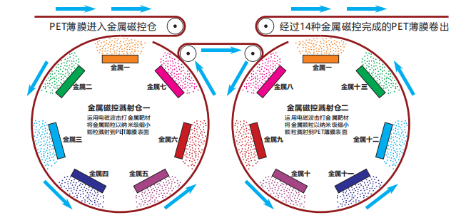 大型双仓十四靶材贵金属磁控溅射设备,能一次性将十四种高贵金属以纳米级别密度涂布与薄膜,生产岀一层具有高隔热性能的薄膜层,能生产岀全球高端的多层贵金属磁控高性能隔热膜产品。